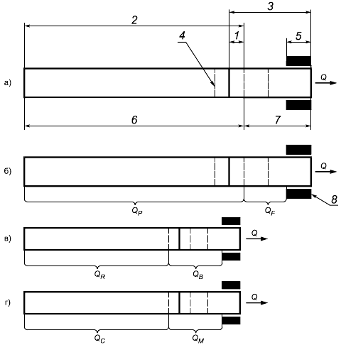 1 - перекрывание ободковой бумагой отрезка сигаретного штранга; 2 - сигаретная бумага; 3 - ободковая бумага; 4 - отметка длины окурка; 5 - стандартная глубина вставки сигареты ГОСТ ISO 3308; 6 - сигаретный штранг; 7 - фильтр; 8 - устройство для вставки сигарет (держатель для сигарет); - общий поток воздуха; - вентиляционный поток фильтра; - вентиляционный поток сигаретного штранга; - вентиляционный поток окурка; - вентиляционный поток сжигаемой части сигаретного штранга; - вентиляционный поток ободковой бумаги; - вентиляционный поток сигаретной бумаги.
