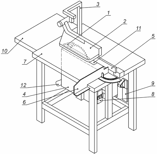 1 - расклинивающий нож; 2 - ограждение (кожух) дисковой пилы; 3 - держатель ограждения дисковой пилы; 4 - неподвижное ограждение дисковой пилы под столом станка; 5 - продольная направляющая линейка; 6 - поперечная направляющая линейка; 7 - стол станка; 8 - органы управления; 9 - ручной толкатель; 10 - удлинитель стола станка; 11 - вставка (вкладыш) стола станка; 12 - патрубок для отсоса стружки и пыли