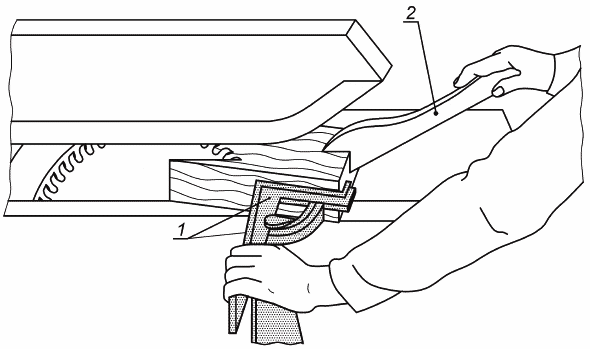1 - устройство для клиновидного резания; 2 - ручной толкатель (направляющая колодка)