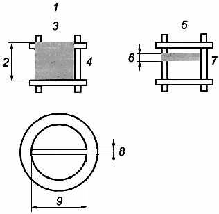 1 - координатный квадрат; 2 - ширина координатного квадрата, мм; 3 - длина координатного квадрата, мм; 4 - заполненный координатный квадрат; 5 - единичная зона на градуированной мембране; 6 - высота сетки для определения единичной зоны, мкм; 7 - единичная зона; 8 - круговая единичная зона на неградуированной мембране; 9 - диаметр рабочей зоны фильтрования мембранного фильтра