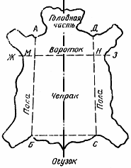 Участок шкуры (кожи), расположенный ниже линии, соединяющей впадины задних лап (см. линию БС на черт.1) и входящий при чепраковании в чепрак