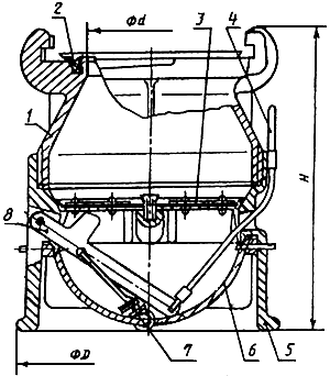 1 верхний корпус; 2 кольцо; 3 клапан; 4 тросик;5 нижний корпус; 6 решетка; 7 пружина; 8 рычаг