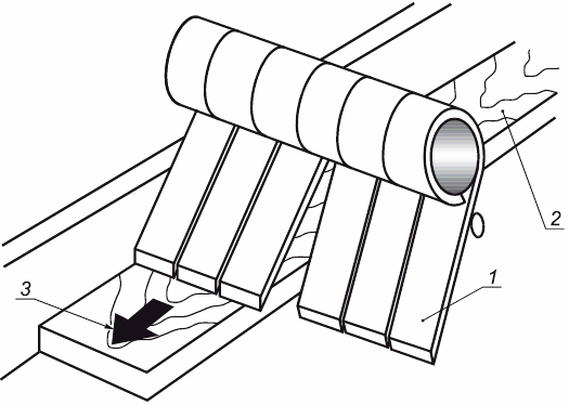 1 - захватывающий элемент (планка, палец); 2 - обработанная заготовка; 3 - направление подачи