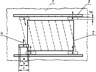 1 - испытательный ковер; 2 - испытательная поверхность размером 700х1000 mm; 3 - шкала, маркированная по ширинам хода; 4 - ход насадки вне испытательной поверхности; - ширина хода; - ширина следа; - ширина насадки; - глубина насадки