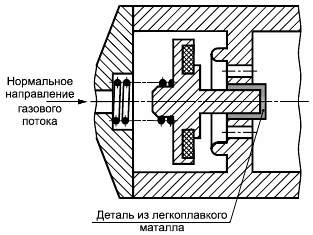 Пример - Клапан (см. рисунок 4) открыт, например, при помощи вставки из легкоплавкого металла, расплавляющейся при длительном повышении температуры, освобождая пружину, под действием которой клапан закрывает выход газа.