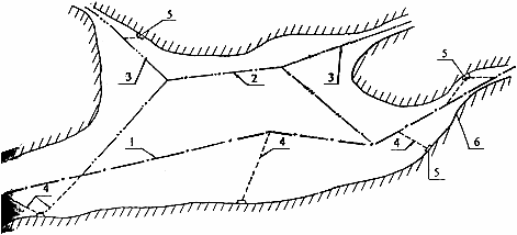 1 - ось основного транзитного судового хода; 2 - ось дополнительного транзитного судового хода; 3 - ось местного судового хода; 4 - ось водных подходов; 5 - причал; 6 - береговая полоса.