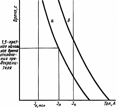 Значение тока, соответствующее пересечению время-токовых характеристик отключения предохранителя и выключателя нагрузки. Способ определения тока пересечения показан на чертеже