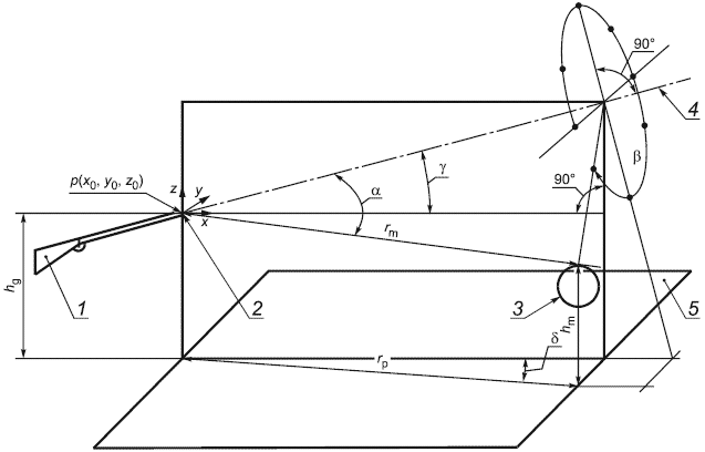 1 - ружье; 2 - дуло; 3 - микрофон; 4 - линия огня; 5 - плоскость земли
