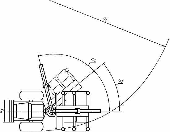 Рисунок 3 - Габаритный диаметр и углы поворота машины с шарнирно-сочленной рамой и манипулятора