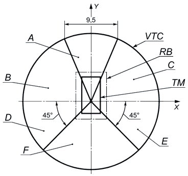 - круг для проверки поля обзора; - прямоугольный контур, расположенный на расстоянии 1 м от габаритного контура машины; - машина для испытаний; - направление машины вперед; , , , , , - сектора обзорности