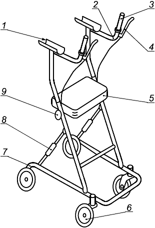 1 - опора для предплечья; 2 - ручка; 3 - рукоятка; 4 - ручка тормоза; 5 - сиденье для отдыха; 6 - колесо; 7 - тормоз; 8 - механизм складывания; 9 - регулятор высоты