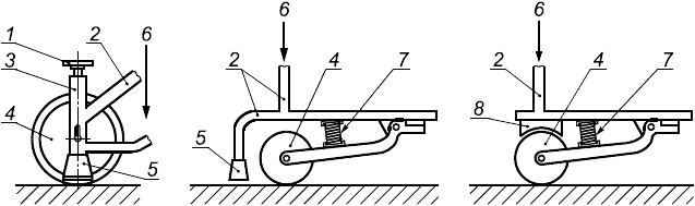 1 - вентиль регулировки пружины; 2 - рама ходунков; 3 - корпус для размещения пружины и оси колеса; 4 - заднее колесо; 5 - резиновый наконечник (тормоз); 6 - усилие, прикладываемое пользователем в точках опоры; 7 - пружина; 8 - тормозная колодка