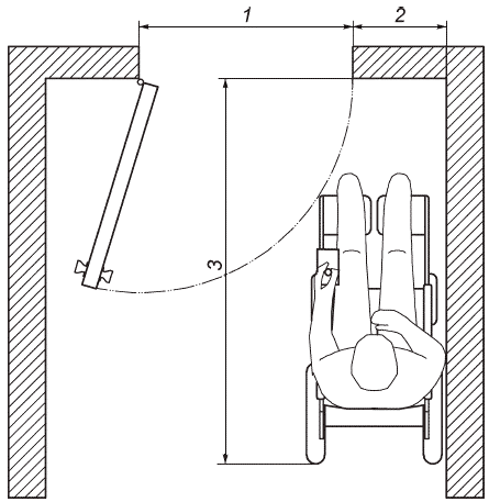 1 - открывающаяся дверь шириной 800 мм; 2 - расстояние до стены 600 мм; 3 - необходимая глубина дверного проема