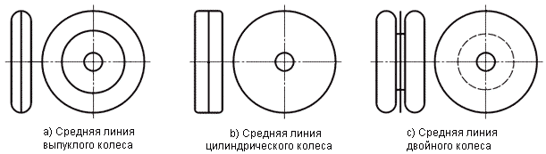 Примечание - Если колесо выпуклое, средняя линия колеса - его наибольший диаметр. Если колесо цилиндрическое, средняя линия колеса расположена на середине его поверхности. В случае двойного колеса средняя линия колеса расположена посередине двух колес (на той же втулке).