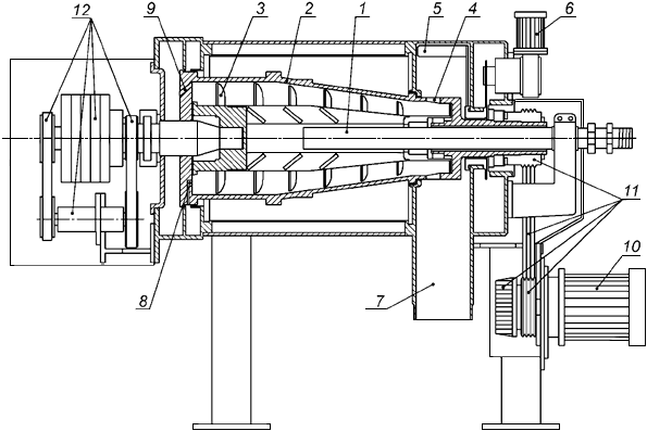 1 - питающая труба; 2 - внутренняя поверхность ротора; 3 - шнек; 4 - выпускное отверстие; 5 - скребок; 6 - электродвигатель; 7 - стенка ротора; 8 - масло; 9 - вода; 10 - электродвигатель; 11 - трансмиссия; 12 - привод