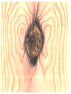 Загнивший или гнилой сучок, в котором древесина полностью или частично превратилась в рыхлую массу ржаво-бурого (табачного) или белесого цвета (черт.56)