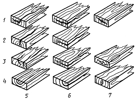 1 - метиковые; 2 - морозные; 3 - трещины усушки; 4 - отлупные;