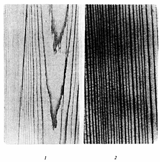 1 - тангентальный (виден по трещинам, ель); 2 - радиальный (виден по