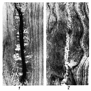 След от закрытой прорости в виде вытянутого участка (шва) свилеватой древесины на поверхности шпона (черт.29)