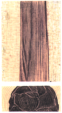 Темное неравномерно окрашенное ядро, граница которого обычно не совпадает с годичными слоями, отделенное от заболони темной (реже светлой) каймой и не отличающееся по твердости от окружающей древесины (черт.57).