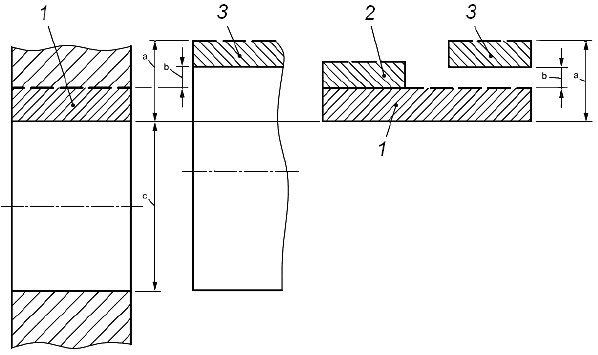 1 - интервал допуска отверстия; 2 - интервал допуска вала, случай 1: нижний предельный размер вала совпадает с верхним предельным размером отверстия, наименьший натяг равен нулю; 3 - интервал допуска вала, случай 2: нижний предельный размер вала больше, чем верхний предельный размер отверстия, наименьший натяг больше нуля; а - наибольший натяг; b - наименьший натяг; с - номинальный размер, равный нижнему предельному размеру отверстия