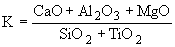 Характеризуется для доменных шлаков по аналогии с портландцементом модулем основности -