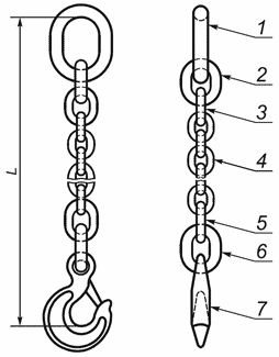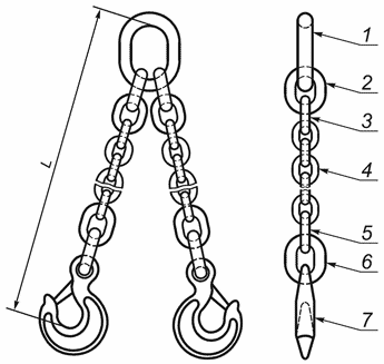 - длина стропальной цепи; 1 - звено для навеса; 2, 6 - переходные звенья; 3, 5 - соединительные звенья; 4 - цепь; 7 - петельный крюк или другая деталь для захвата
