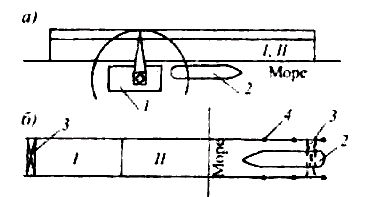 а - парк в приурезовой зоне; б - раздельный массивовый парк; I, II - парки изготовления и хранения; 1 - плавучий кран; 2 - плавучее транспортное средство; 3 - козловой кран; 4 - свайная эстакада для перемещения козлового крана