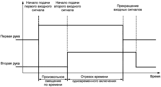 Одновременное приведение в действие обоих органов управления независимо от смещения по времени между началами первого входного сигнала и второго входного сигналов (см. рисунок 2).