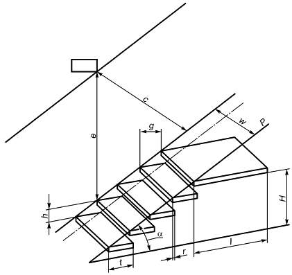 H - высота подъема; g - проступь; е - высота в свету; l - длина площадки; r - нахлест; Р - осевая линия; - угол наклона лестницы; h - высота ступени; w - ширина лестницы; t - ширина ступени; с - просвет