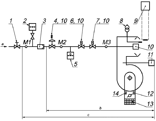 1 - ручной отсечной клапан; 2 - манометр для измерения давления газа; 3 - фильтр; 4 - регулятор давления газа; 5 - устройство контроля давления газа; 6 - предохранительное отсечное устройство; 7 - управляющее устройство; 8 - устройство зажигания; 9 - датчик контроля пламени; 10 - устройство предварительной настройки; 11 - устройство контроля вентилятора; 12 - позиционный переключатель низкого расхода воздуха; 13 - предохранительное устройство для вращающихся деталей, например решетка; 14 - позиционный переключатель высокого расхода воздуха; М1 - точка измерения давления на входе; М2 - точка измерения давления на выходе регулятора давления газа; М3 - точка измерения в головке горелки; - топливный газ;