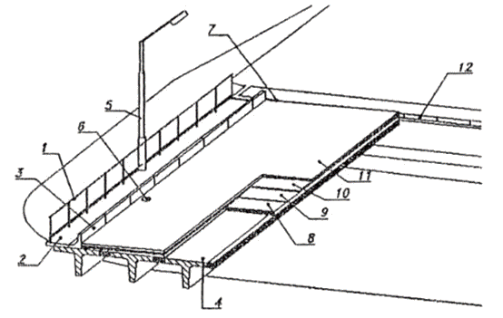 1 - перильное ограждение; 2 - тротуарный блок; 3 - ограждение безопасности (бортовой камень, барьер); 4 - плита проезжей части; 5 - мачта освещения; 6 - элементы водоотвода; 7 - деформационный шов; 8 - выравнивающий слой (сточный треугольник); 9 - гидроизоляция; 10 - защитный слой гидроизоляции; 11- покрытие; 12 - переходные плиты