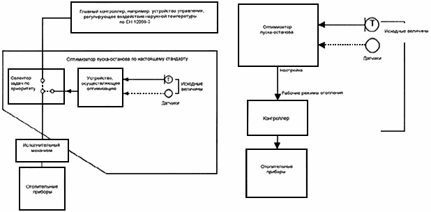 Устройство управления, которое выполняет функции оптимального пуска и останова систем отопления, причем функция пуска должна обеспечивать компенсацию тарифа. В состав устройства входят электронный контроллер, выдающий выходные сигналы, и датчики измеряемых величин. Устройство не включает в себя исполнительные механизмы. Пример применения оптимизатора пуска-останова показан на рисунке 4.