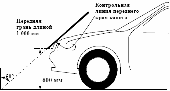Означает геометрическое место точек контакта между прямой гранью длиной 1000 мм и передней поверхностью капота, когда прямая грань, параллельная вертикальной продольной плоскости автомобиля и образующая с вертикалью угол 50° в заднем направлении транспортного средства с нижним концом на высоте 600 мм над уровнем грунта, проходит в поперечном направлении и касается переднего края капота (см. рис.1).