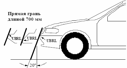 Означает линию, определяющую верхний предел существенных точек контакта пешехода с бампером. Она определяется в качестве геометрического места самых верхних точек контакта между прямой гранью длиной 700 мм и бампером, когда эта прямая грань, параллельная вертикальной продольной плоскости и наклоненная назад под углом 20° к вертикали, пересекает переднюю часть транспортного средства, сохраняя контакт с землей и поверхностью бампера (см. рис.10).