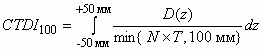 Интеграл от профиля дозы в одном аксиальном срезе вдоль линии, перпендикулярной к томографической плоскости, от минус 50 мм до плюс 50 мм, деленный либо на произведение числа томографических срезов и номинальной томографической толщины среза