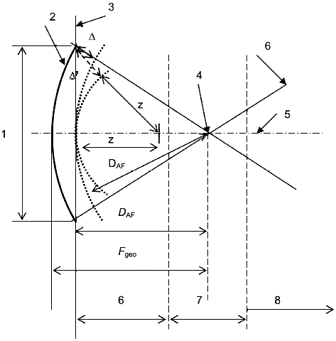 1 - ширина апертуры преобразователя; 2 - фокусирующая поверхность преобразователя; 3 - плоскость апертуры преобразователя; 4 - геометрический фокус; 5 - ось пучка; 6 - геометрические границы пучка; 7 - ближняя зона Френеля (при ); 8 - фокальная зона Фраунгофера (при