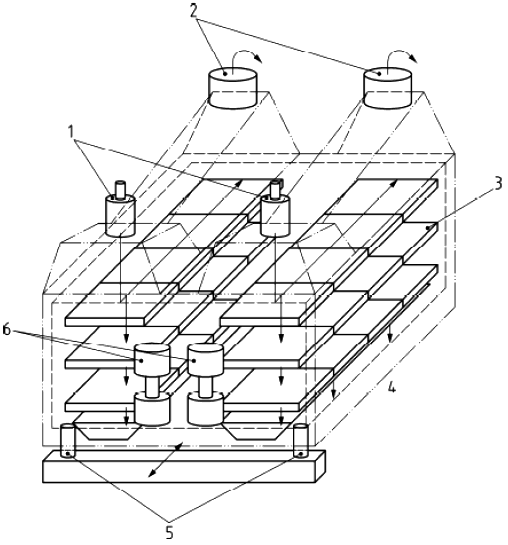 1 - отверстие для подачи продукции; 2 - точка аспирации; 3 - сита; 4 - отверстие для выпуска продукции; 5 - поддерживающие пружины; 6 - вибрационные устройства