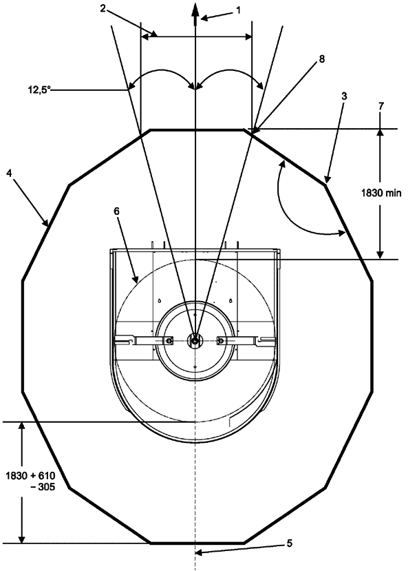 1 - направление вперед; 2 - ширина зоны расположения оператора; 3 - минимальный угол между плоскими панелями (не менее 125°); 4 - стены-мишени; 5 - косилка должна быть расположена как можно ближе к центру; 6 - круг вращения кончиков режущих элементов; 7 - минимальное расстояние до стены-мишени в зоне расположения оператора; 8 - точки пересечения проецирующих линий со стеной-мишенью