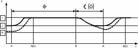 I, J, K - режимы, например: I - номинальный; J - экономичный; K - дежурный; А - момент включения режима I; А(0) - начало периода пребывания людей; В - момент включения режима J (или К); А-В - период режима I; А(0)-В - период пребывания людей при режиме I; А-А(0) - период пуска; - температура в помещении;