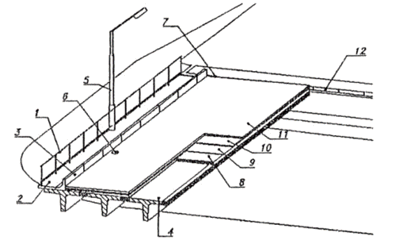 1 - перильное ограждение; 2 - тротуарный блок; 3 - ограждение безопасности (бортовой камень, барьер); 4 - плита проезжей части; 5 - мачта освещения; 6 - элементы водоотвода; 7 - деформационный шов; 8 - выравнивающий слой (сточный треугольник); 9 - гидроизоляция; 10 - защитный слой гидроизоляции; 11 - покрытие; 12 - переходные плиты