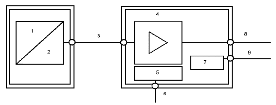1 - неэлектрическая величина; 2 - электрическая величина; 3 - канал связи; 4 - формирователь сигнала; 5 - модуль связи и управления; 6 - порты ввода/вывода; 7 - источник питания; 8 - сигнальный порт; 9 - разъем питания переменного/постоянного тока