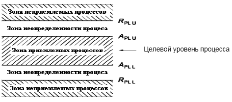 Рисунок 1 - Границы требований к процессу: верхняя и нижняя линии APL и RPL, зоны приемлемости и неприемлемости и неопределенности процесса