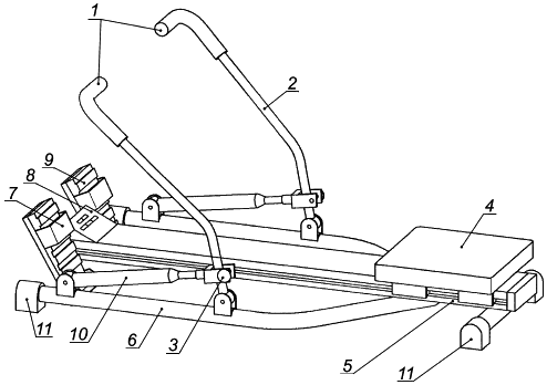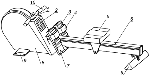 1 - рукоятка; 2 - рычаг для гребли; 3 - регулировка натяжения; 4 - сиденье; 5 - рейка; 6 - рама; 7 - ремень для стопы; 8 - дисплей; 9 - упор для стопы; 10 - поршень гидравлического/пневматического цилиндра; 11 - опора