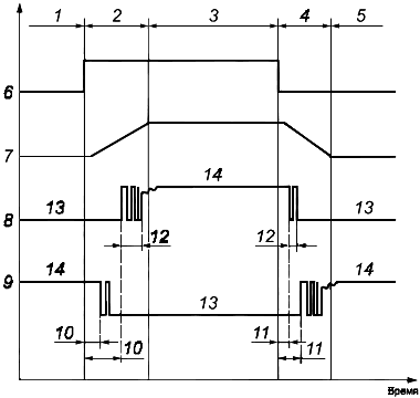 1 - начальное состояние; 2 - срабатывание; 3 - конечное состояние; 4 - возврат; 5 - начальное состояние; 6 - напряжение на катушке; 7 - изменение положения подвижных частей; 8 - напряжение при замыкании контактов; 9 - напряжение при размыкании контактов; 10 - время срабатывания; 11 - время возврата; 12 - время дребезга; 13 - открыто; 14 - закрыто