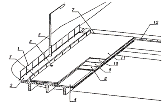 1 - перильное ограждение; 2 - тротуарный блок; 3 - ограждение безопасности (бортовой камень, барьер); 4 - плита проезжей части; 5 - мачта освещения; 6 - элементы водоотвода; 7 - деформационный шов; 8 - выравнивающий слой (сточный треугольник); 9 - гидроизоляция; 10 - защитный слой гидроизоляции; 11 - покрытие; 12 - переходные плиты