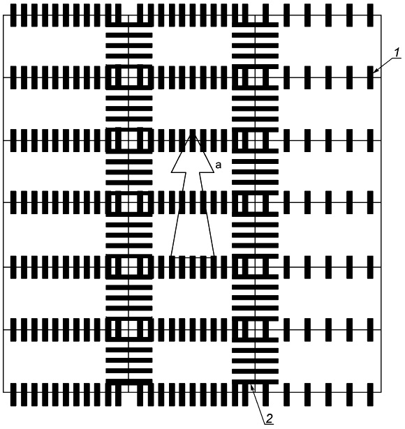 1 - поперечные соединительные арматурные стержни; 2 - продольные стягивающие арматурные стержни; а - стрелка, указывающая на направление продвижения машины для устройства дорожного покрытия со скользящей опалубкой