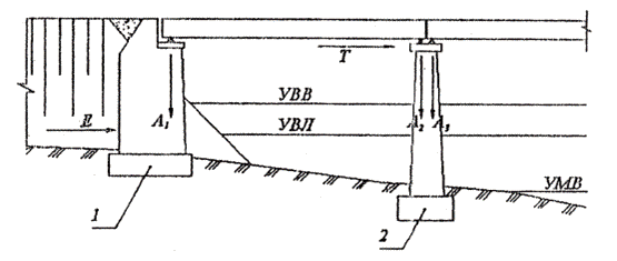 1 - береговая опора; 2 - промежуточная опора; А, А