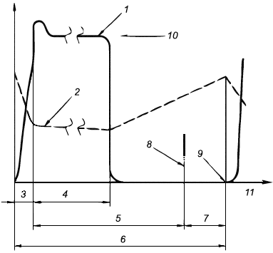 Рисунок 1 - Пример диаграммы зависимости давления на материал (сплошная линия) и продольного положения шнека (прерывистая линия) от времени цикла