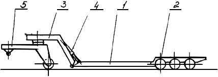 Состоит из грузовой платформы 1, опирающейся на три оси 2, хобота 3, гидроцилиндров 4, и тележки 5.